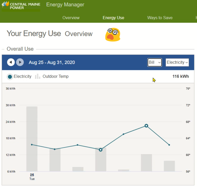 So yeah, the big maybe not in the Energy Use screen goes like this… upon entering the screen and seeing graph with YEAR detail, select ‘Bill’. When BILL graph is displayed, select the left arrow to navigate to the previous Bill Cycle. Yay, it shows July 25th through August 25th. Wow look how cold it was on August 24th!