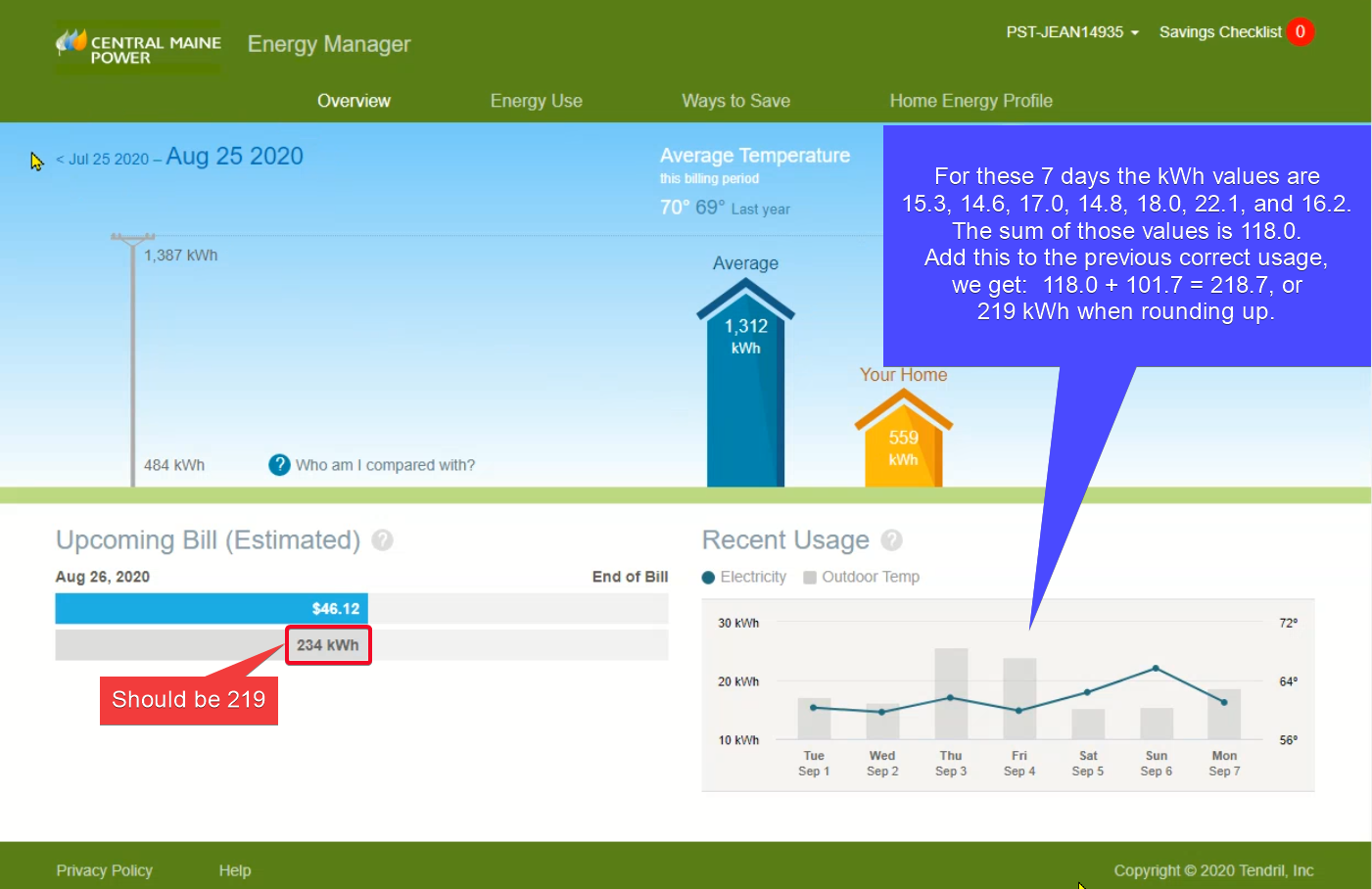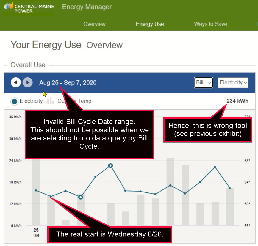So we see the same problems as before – this screen is adding the value 15.6 from the 8/25 date. Since it should not be adding it, the value is really 219 kWh, as we’ll see in the next exhibit.